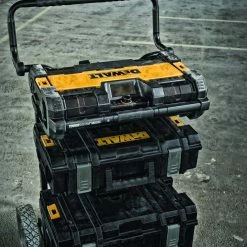 The DeWalt Toughsystem Radio boasts fantastic sound quality and excellent bass and as well as charging your 10.8v, 14.4v or 18v XR batteries will charge your phone via USB, play your phone or MP3 player sounds via Bluetooth and all through the 6 best in class speakers. Powered by AC cable (included) or by your power tool XR battery (not included) and compatible with all Toughsystem boxes, it stacks neatly on top of your other Toughsystem toolboxes or on a Toughsystem trolley or can be used as a standalone radio.