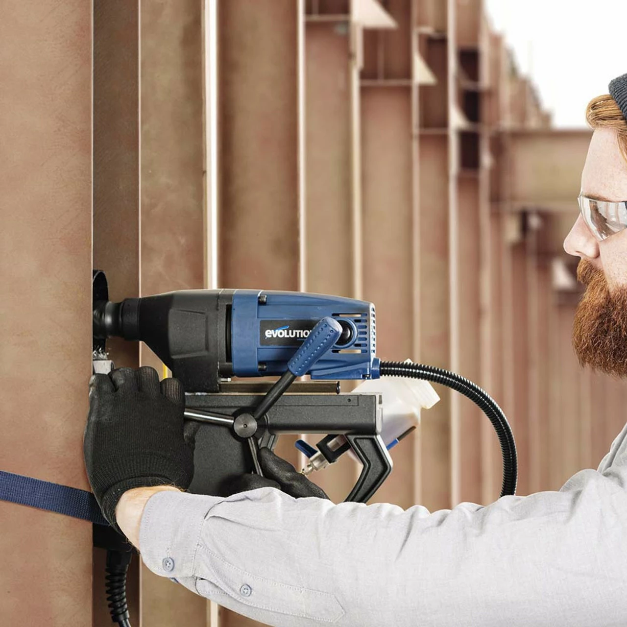 The Evolution EVOMAG28 Magnetic Drill is ideal for bridges, I-beams and framework. Deceptive in its capabilities, although small in size it is highly productive in heavy-duty industrial and fabrication work. Easy to carry and position in both awkward and confined spaces, due to its compact dimensions.