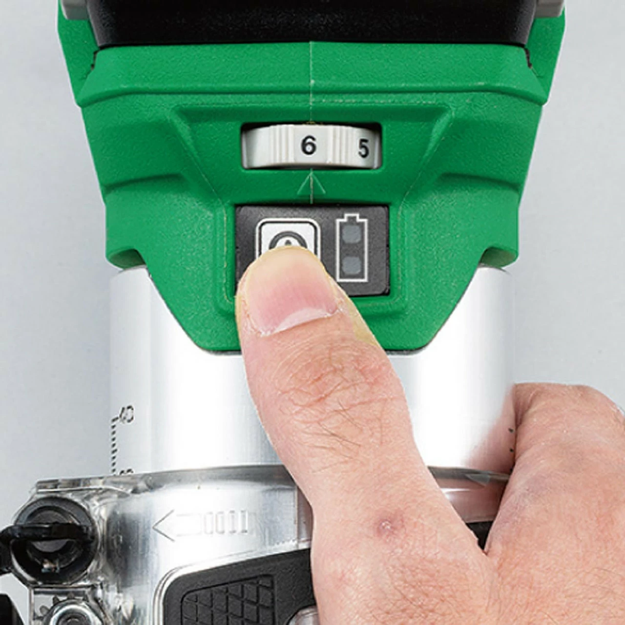 The HiKOKI M1808DA 1/4in Trimmer has a lightweight design and an easily accessible motor switch for one-handed operation. The user is required to press the buttons in sequence to start the trimmer for added safety.