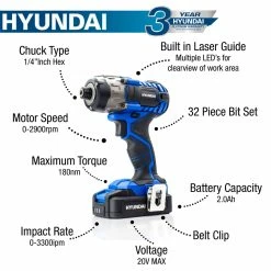 Hyundai HY2177 20V Max 180Nm Impact Driver with a 32-Piece Drill Bit Accessory Set & 1x 2.0Ah Battery