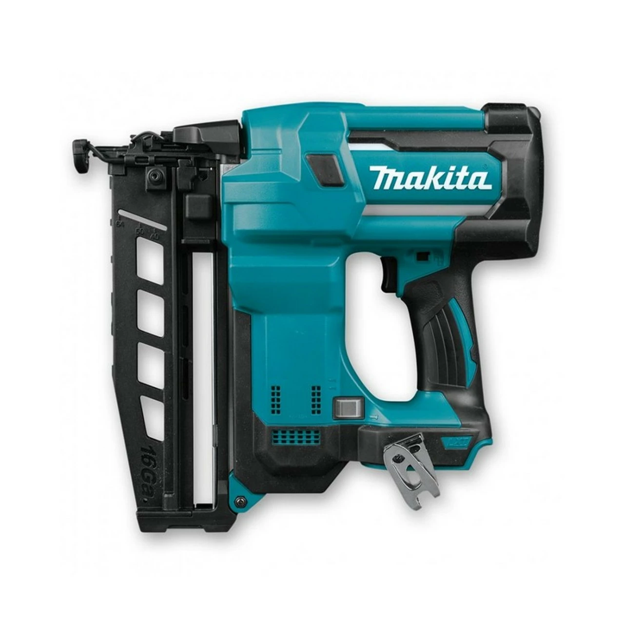 Compact finishing nail gun with ergonomic handle. Centre point allows for quick and easy access to any desired fastening point. Driving depth can be adjusted with a dial. Features an LED work light. Window shows number of remaining nails. Rocker switch for selecting sequential or bump fire mode. Compatible with Makita 18V LXT batteries. Supplied with MAKPAC stacking case. The DBN600ZJ nailer takes 16 gauge straight brad nails from 25mm to 64mm in length. It has driving depth adjustment for perfect nailing in different materials. The 110-nail capacity magazine has a window allowing you to see the nails remaining in the machine.