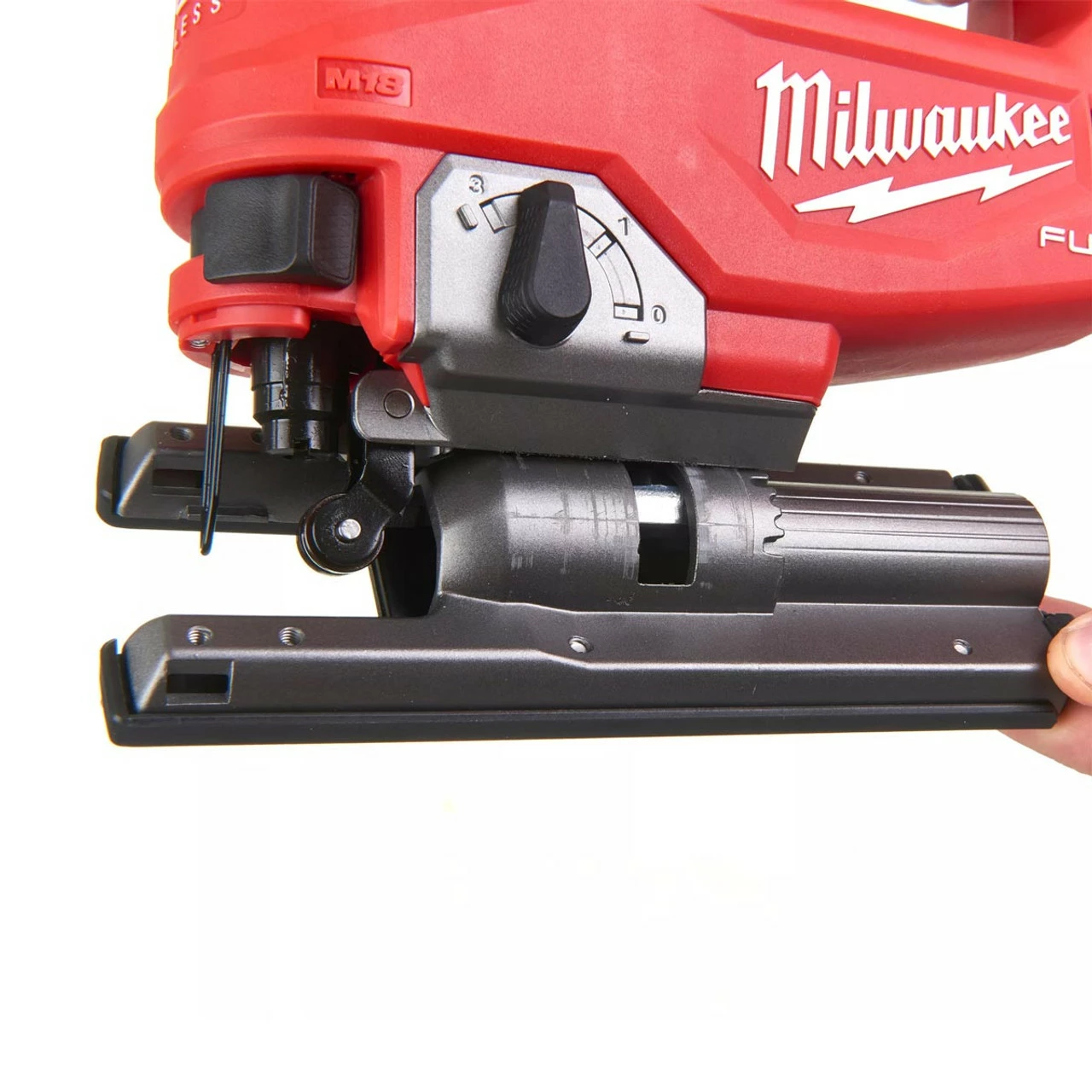 The Milwaukee M18 FJS FUEL Top Handle Jigsaw is fitted with a Milwaukee designed and built brushless POWERSTATE motor for fast cutting and long tool life. The Milwaukee patented FIXTEC blade clamp provides fast and easy blade change. Keyless bevel facility on the base plate allows for adjustment between 0-45°. With a 5-stage pendulum action for increased cutting performance. The detachable soft shoe avoids marks and scratches when cutting soft materials. A dust blower keeps the cut line free of wood dust and an integrated LED light provides workspace illumination.